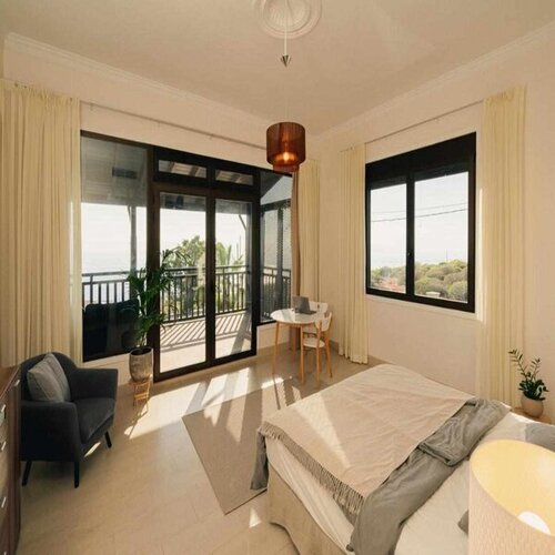 Ocean-view sunny suite. This suite is recommended for those who love panoramas, spacious areas, and sunrises. At night, a fabulous sight is revealed by the illuminated part of the island. The suite, with a size of 88 m2, features a huge terrace and two separate entrances to the rooms. One room is equipped with a kitchen and welcomes guests with two separate bathrooms featuring a hand and overhead shower. The decorative pieces are carefully selected, and the majority of the plants are live. and are for 5 people only (shared, no single option). Shared double room with 5 separate beds.